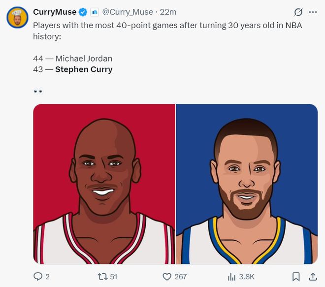 3.30岁后库里拿到43次40+仅次于乔丹。