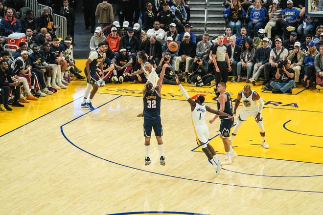 NBA常规赛继续进行,勇士坐镇主场与掘金展开激战。金州在揭幕战力擒湖人,目前斗志旺盛。此役,科尔沿用了斯蒂芬库里、德拉蒙德格林、吉米巴特勒、库明加与波杰姆斯基的首发五虎,穆迪、梅尔顿伤停。丹佛在休赛期得到了卡梅隆约翰逊、瓦兰丘纳斯、布鲁斯布朗、小哈达威4大悍将,被视为夺冠热门。此役,掘金的首发五虎是约基奇、穆雷、戈登、布劳恩与卡梅隆约翰逊,丹佛全员健康。两大豪门的对决,一触即发。