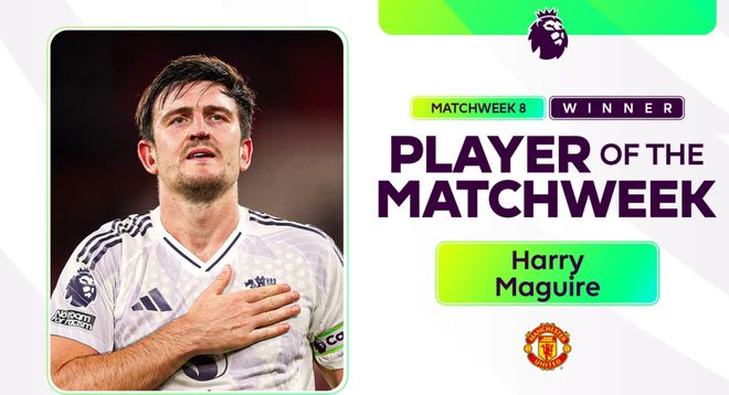 英超官方:曼联后卫马奎尔当选第8轮最佳球员