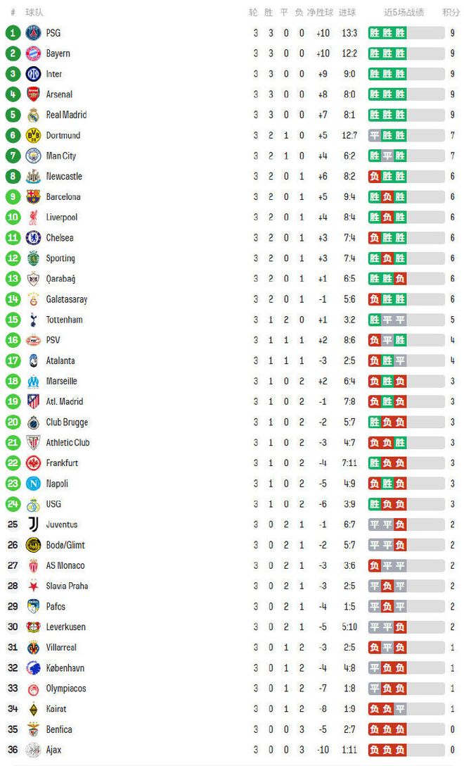 保持全胜的球队分别是卫冕冠军巴黎圣日耳曼,还有拜仁、国米、阿森纳和皇马。其中,巴黎凭借净胜球优势暂时领跑欧冠积分榜。大黑马卡拉巴赫本轮客场被毕巴逆转后。2连胜终结遭遇首败。