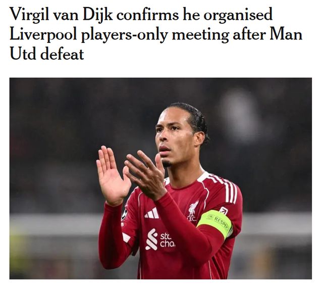 范戴克透露:“所有人的情绪都很低落,主场输给曼联,这在过去数年并不常见。这不是一次处理危机的会议,但我们相信,一切都可能会好转。我们向主帅斯洛特作过汇报,全队也单独进行会议。我们不是每场比赛之后都会有会议,但这次,我有一些想法表达出来。”