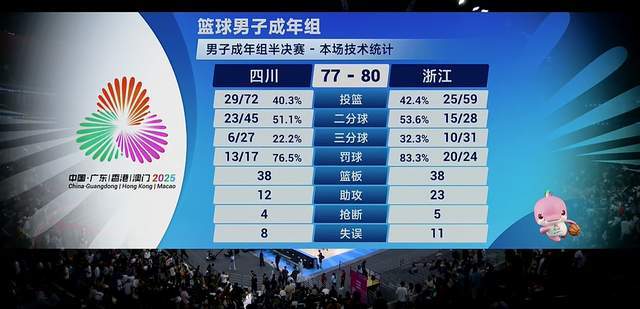 而浙江队呢,王奕博18分4篮板5助攻,刘泽一13分4篮板,程帅澎12分5助攻,余嘉豪14分9篮板4助攻。