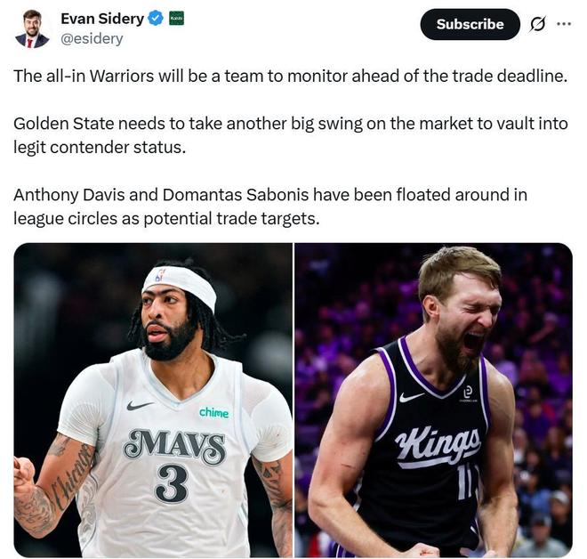 根据名记Evan Sidery报道,勇士是本赛季交易截止日前最值得关注的球队之一,他们正在酝酿大交易,以全力向冠军发起冲击。