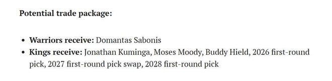 为此,美媒《SI》送给勇士队一笔6换1交易支招,认为勇士队可以打包库明加、穆迪追求小萨博尼斯打造库里+小萨+巴特勒+追梦的4巨头,具体交易内容如下: